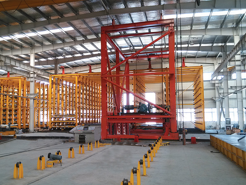 码垛机:横向行走由变频制动电机驱动,横向走行装有夹轨导向装置、横向定位装置,保证横向走位精度,码垛车与养护窑重复位置精度不变。模台存取机移动到将要出模的位置,首先取模机构伸出,将模具勾住伸缩,将模具拉至吊板输送架能够驱动模具的位置后,吊板输送架驱动模台,到位后,输送架下落,模台存取机横移到正对脱模工位,送至脱模工位。